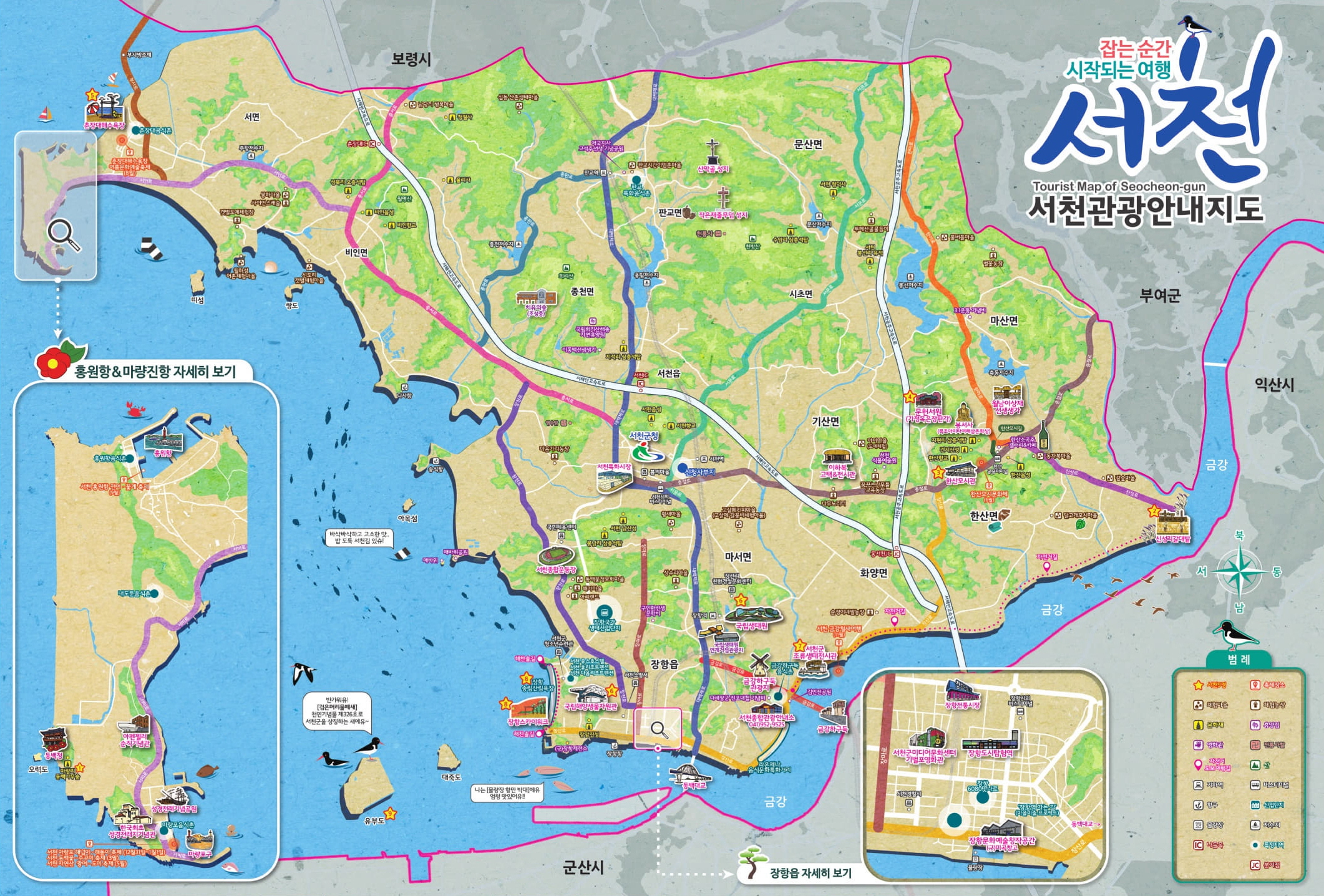 서천군문화관광안내지도로서 지도를 통해 서천9경,체험마을,문화재,영화관,자전거/도보여행길,기차역,항구,물량장,나들목,축제장소,체험농장,휴양림,전통사찰,산,버스터미널,산업단지,저수지,특정지역,분기점등을 확인할 수 있습니다.